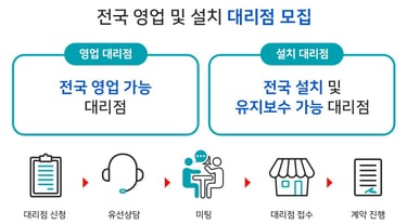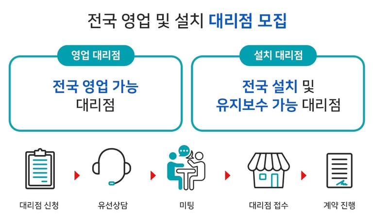 ●지사 및 대리점●희망 영업 지역 선정●가맹비 및 보증금 납부(지사 및 대리점,가입 계약서 작성)●교육( 이론 및 현장 교육 1주~2주) ●대리점 사업 활동 시작